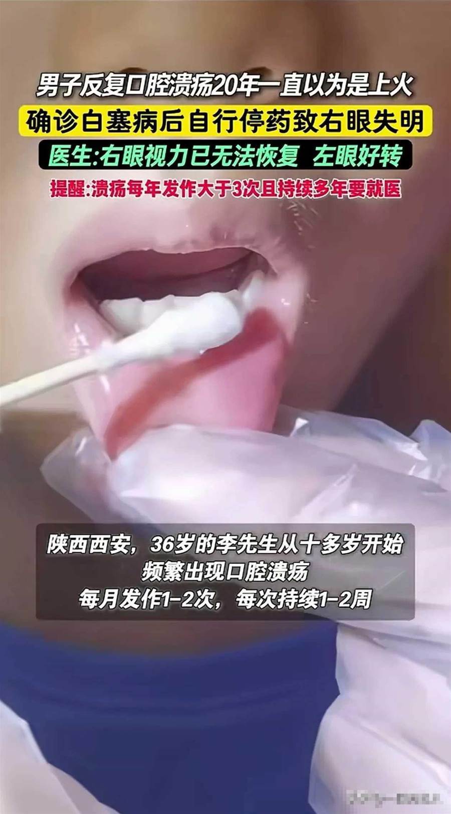 如今,李先生左眼需要定期注射藥物控制病情,口腔裡偶爾還會有潰瘍,但他再不敢忽視任何一個訊號。他的病例在診室裡被醫生反覆提起,成為警示:如果口腔潰瘍每年發作超過三次,且持續多年,絕不能簡單地歸為「上火」。