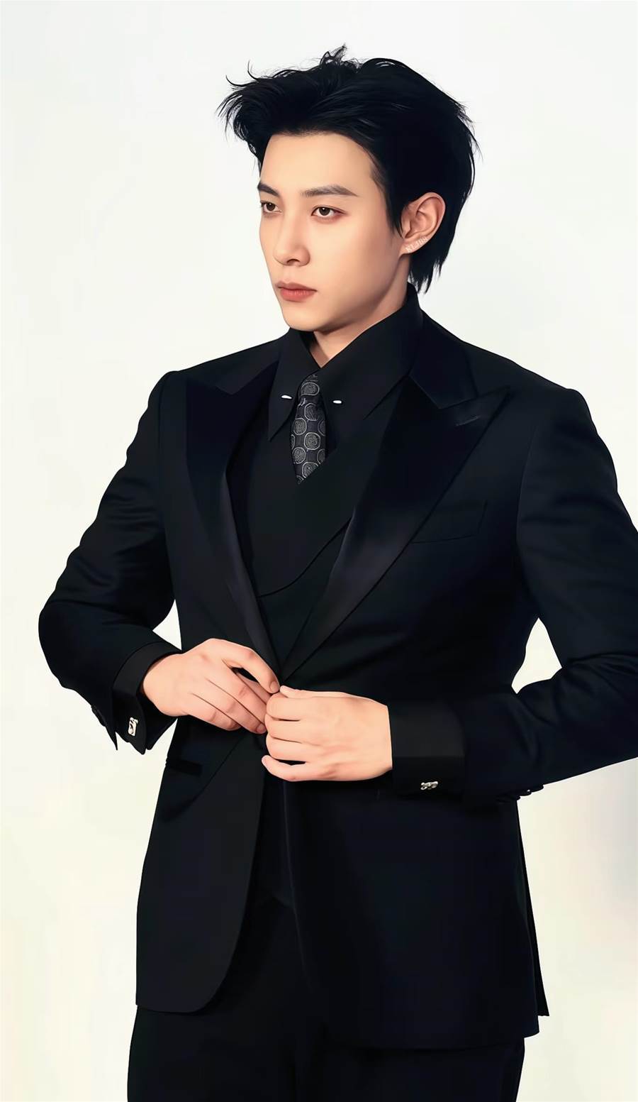 再看他的線下生圖臉部有些發腮乾癟、皮膚狀態粗糙、黑眼圈明顯,整體看起來比精修圖老了不少,而且現代裝會暴露一些顏值短板。