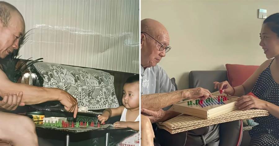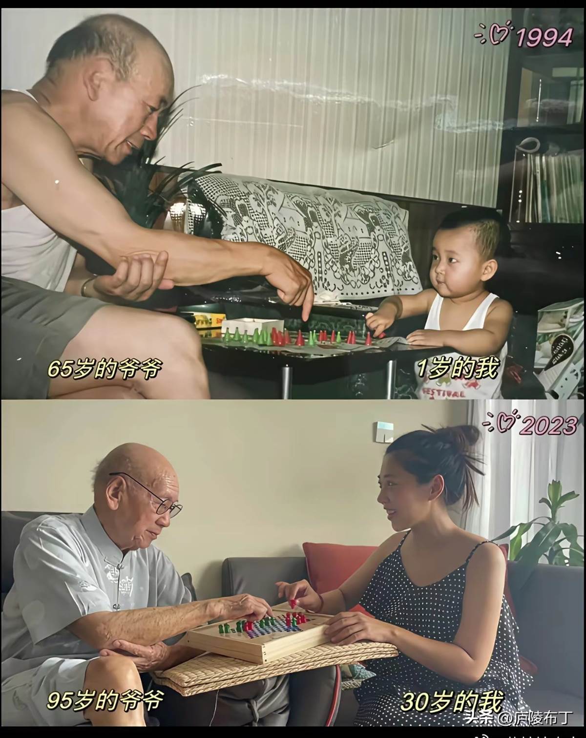 第二張照片則是在2023年拍攝的,此時的小女孩已經長成了30歲的成熟女性,而爺爺也已是95歲高齡。兩人依舊在下棋,但角色似乎發生了轉換,孫女的眼神中充滿了對爺爺的關愛和尊敬。爺爺雖然年事已高,但精神矍鑠依然,兩人的對弈似乎成為了一種跨越時間的傳承。