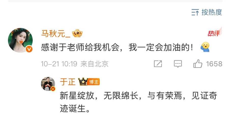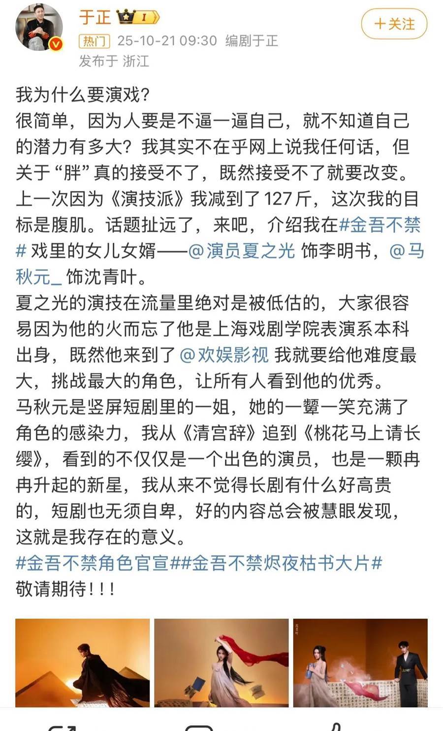 于正同時也發文說道:馬秋元是豎屏短劇里的一姐,她的一顰一笑充滿了角色的感染力,我從《清宮辭》追到《桃花馬上請長纓》,看到的不僅僅是一個出色的演員,也是一顆冉冉升起的新星,我從來不覺得長劇有什麼好高貴的,短劇也無須自卑,好的內容總會被慧眼發現,這就是我存在的意義。
