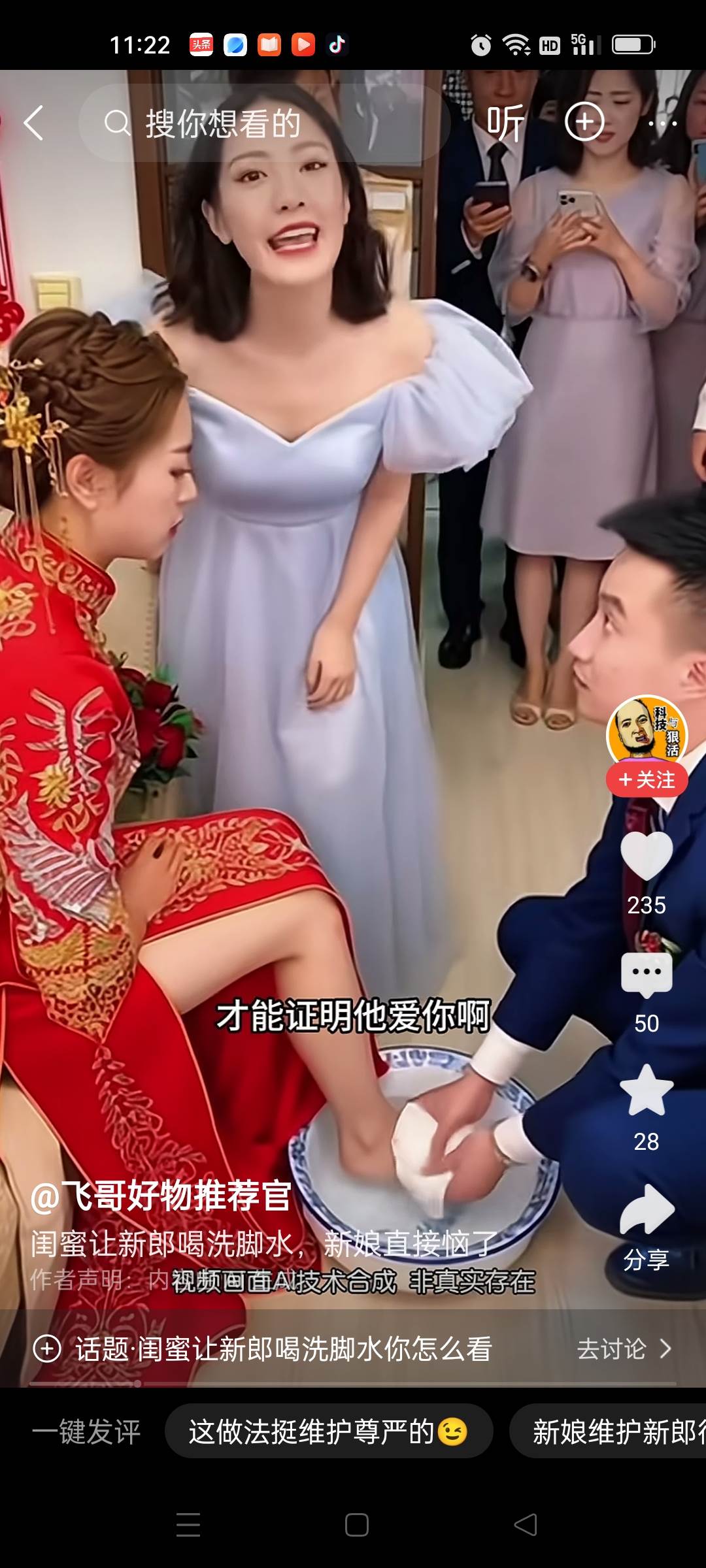 婚禮的習俗環節,新郎正蹲在紅色的洗腳盆前,仔細地為新娘清洗雙足。水溫恰到好處,他的動作輕柔,像是在進行一場安靜的儀式。圍觀的親友們笑著拍照,現場充滿溫馨的氣氛。