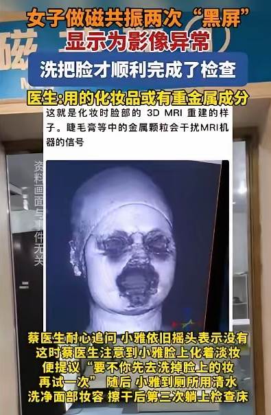 做個磁共振連續兩次卡殼?福建泉州29歲的姑娘小林最近就遇到了這事,頭暈去醫院做頭顱檢查,明明沒帶金屬首飾,機器卻頻頻「罷工」,最後洗了把臉竟順利通關,背後原因讓不少愛化妝的人捏了把汗。