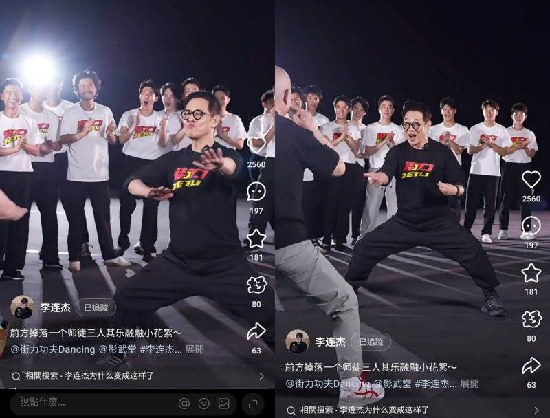 李連杰近日頻頻在社群平台上分享練習片段,只見他身穿黑色T恤,精神飽滿地隨節奏起舞,將拳腳功夫流暢融入舞蹈動作中,一旁的年輕舞者看得驚嘆不已。