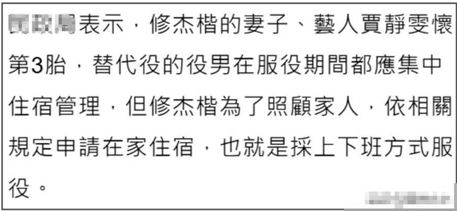 ——原來修杰楷當年沒能用上偽造材料,他的老婆賈靜雯懷上了三胎,修杰楷就服了替代役,只需要到相關部門上下班五個月就可以了,對比正式服役更輕松,還可以每天回家。
