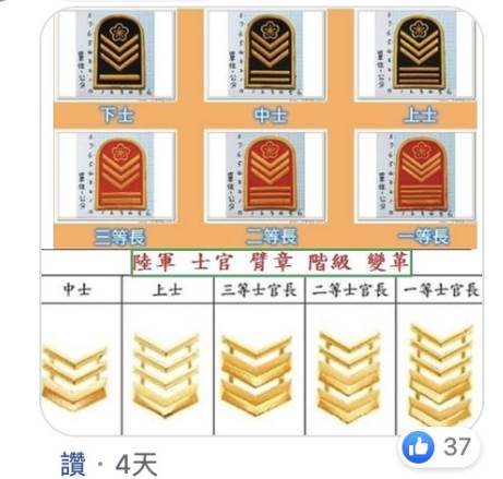 一開始大家眾說紛紜,結果民眾貼出一張軍階表,解開大家疑惑。原來這位老伯伯的正確軍階是「陸軍上士」,有部份網友還說明,以他的徽章歷史來看,應該是國戰時期的最高軍官!一般都是對國有貢獻才有此證「若是沒有他們的貢獻,就沒有我們這些後代子孫」!