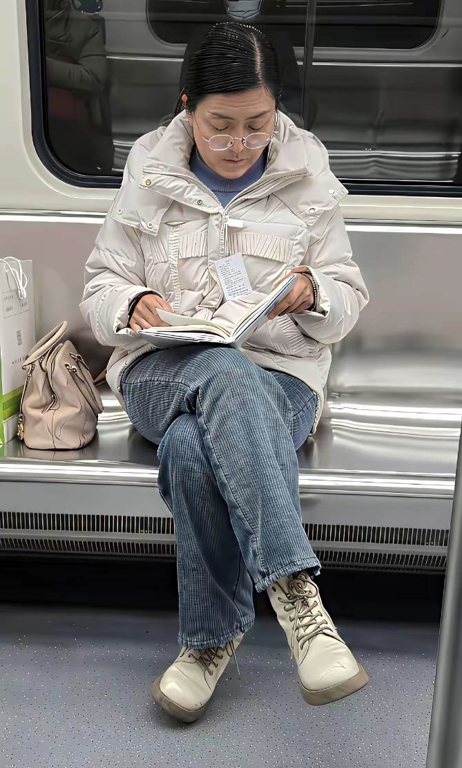 我點開大圖。畫面中,一位女士安靜地坐在靠窗的位置,穿著米白色的羽絨服和深藍牛仔褲,腳上是同色短靴,裝扮得體。她微微低頭,似乎在閱讀手中的書,姿態從容。乍看之下,這只是一個再普通不過的通勤場景。