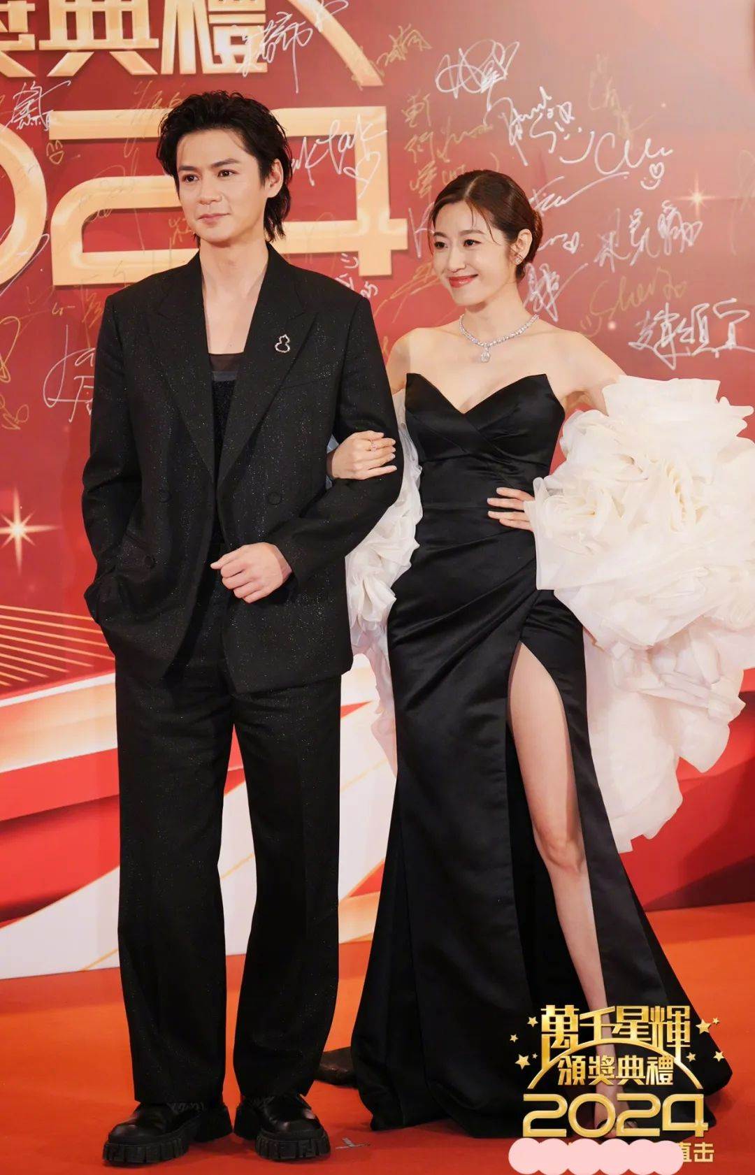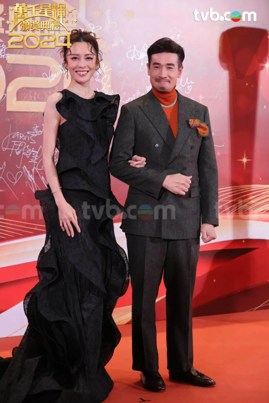 羅子溢(羅仲謙)和陳自瑤都穿了黑色禮服,40歲的羅子溢看起來還是35+的樣子,一身休閑西裝很有港風潮男的感覺;43歲的陳自瑤更是看不出年齡感,而且這身搭配了白色立體披肩的黑色禮服很有質感,是拿到內地紅毯上也不會輸的造型。