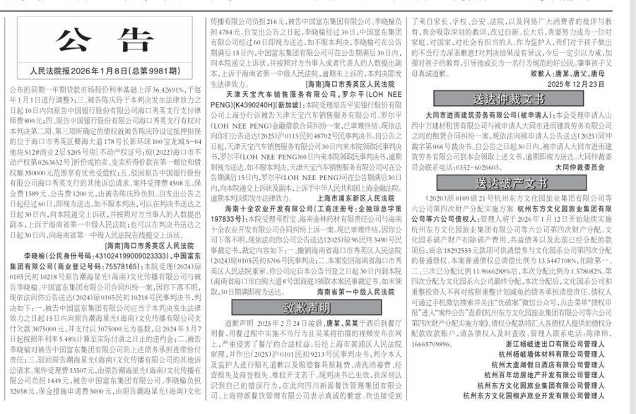 2026年1月8日,《人民法院報》3版刊登了海底撈小便當事人唐某及其父母的道歉聲明。 人民法院報電子版截圖