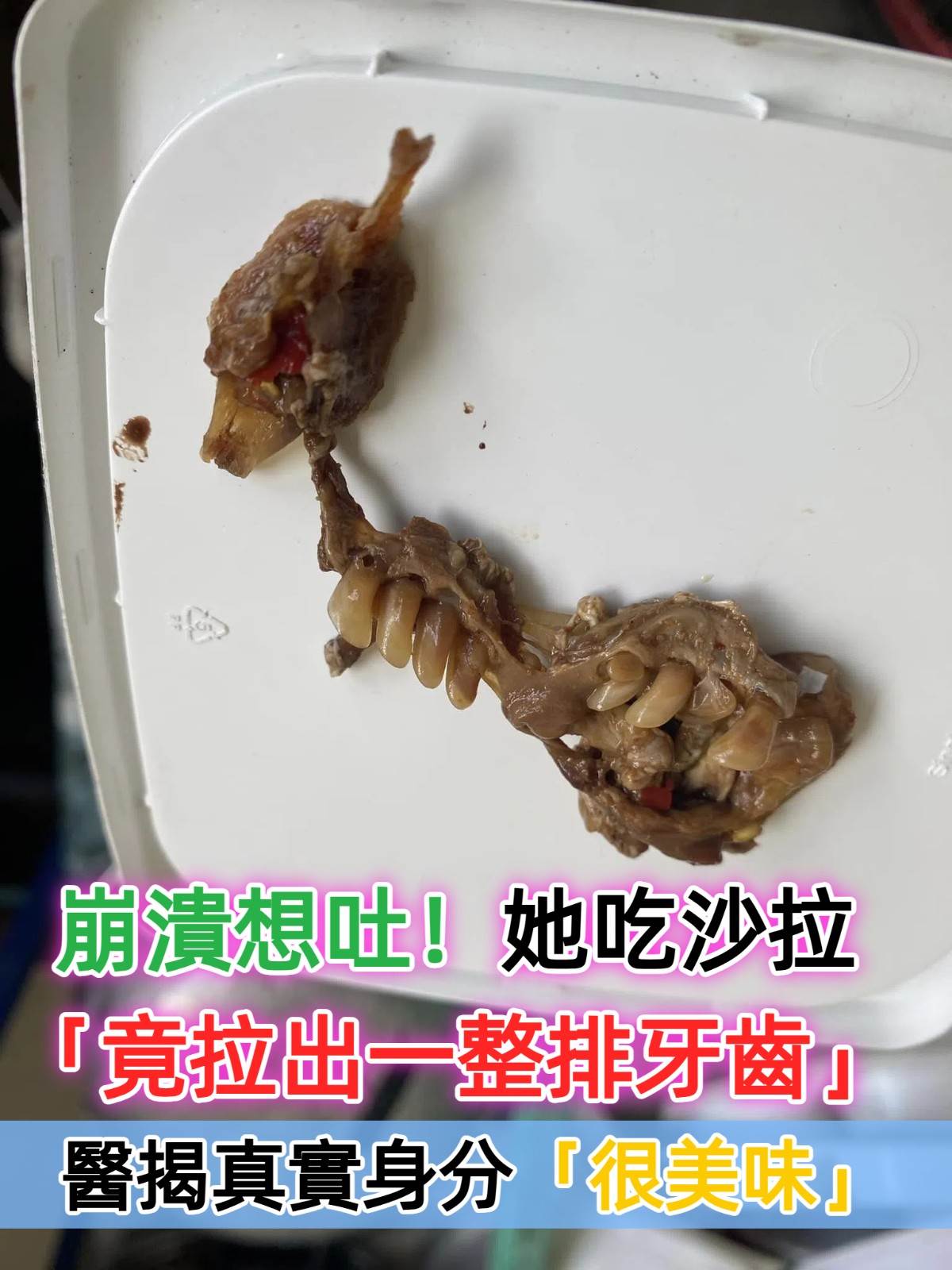 這個詭異發現讓女子瞬間反胃作嘔,她在貼文中懊惱地表示:「這到底是什麼東西的骨頭?我還要吐多少次才能把胃裡的沙拉全吐光?」雖然她試圖說服自己可能是發酵魚的骨頭,但一想到魚類通常不會有這種牙齒,就更加困惑且恐慌。為了解開謎團,她將「帶牙骨頭」的照片分享到網路上,但這次的用餐經驗已經讓她對最愛的發酵魚青木瓜沙拉徹底失去食慾。