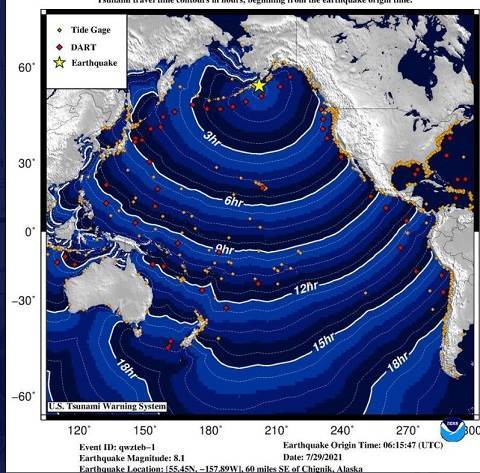震後首波海嘯預計將抵達阿留申群島的山德角(Sand Point)村落,該地區人口僅約580人。阿拉斯加州緊急應變單位在地震發生約一小時後表示,目前尚未接獲任何災損通報。