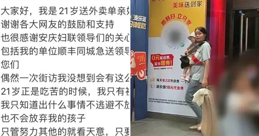 2018年,陳女士結婚。2019年,她的丈夫不幸交通事故去世,女兒五六個月大時,母女二人就被婆婆趕出家門。陳女士只好帶著孩子從江西到安徽安慶打工。選擇送外賣是因為「工資高,能帶孩子」。