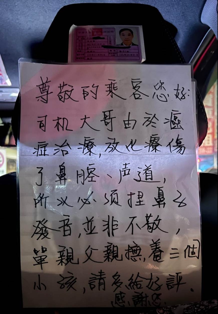 師傅沒爭辯,只抬手指了指副駕駛前擋風上的貼紙。我順著他的手指看去,白底黑字的A4紙貼著幾行字:「因癌癥化療傷及鼻腔與聲帶,說話需捏鼻發聲,絕非不敬。