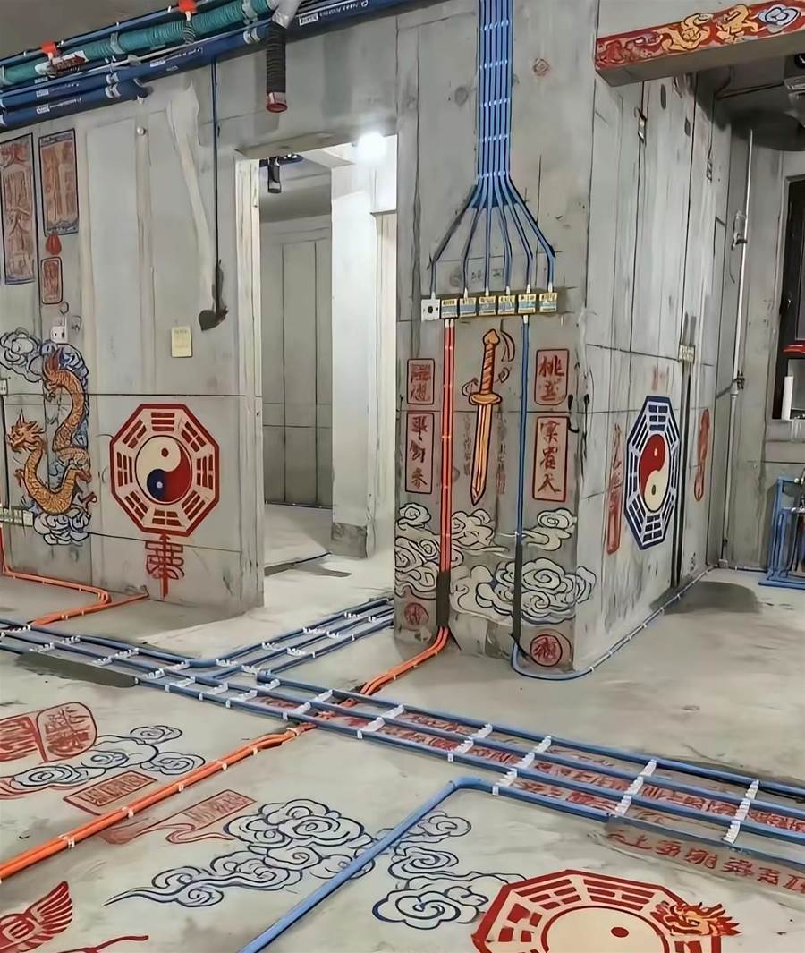 幹了十幾年裝修的老張,第一次在工地上愣住了。眼前這戶正在做水電改造的毛坯房裡,景象有些不同尋常。粗糙的水泥牆面和地面佈滿了新鋪設的藍色PVC管道,縱橫交錯,這是再常見不過的裝修前期場景。然而,就在這些冰冷的管道之間、裸露的磚牆之上,被人用鮮豔的紅色顏料,畫滿了各式各樣的圖案和文字。