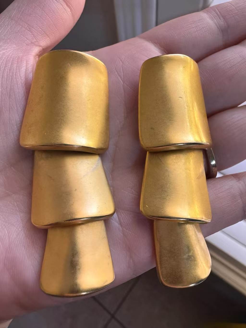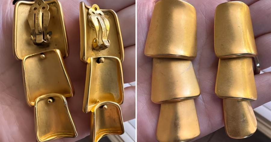 就在分揀過程中,兩串造型別緻的金色片飾突然從衣物堆中滑落。每串由三截竹節狀的金片相連,背面帶有彈簧夾子,既非胸針,也非常見的髮飾或衣扣。初看金光閃閃,讓人不禁聯想到貴重黃金,但經過簡單測試,才發現只是鍍金材質。然而,真正引人注目的是夾子上刻著的一行小字:「FRANCE」。