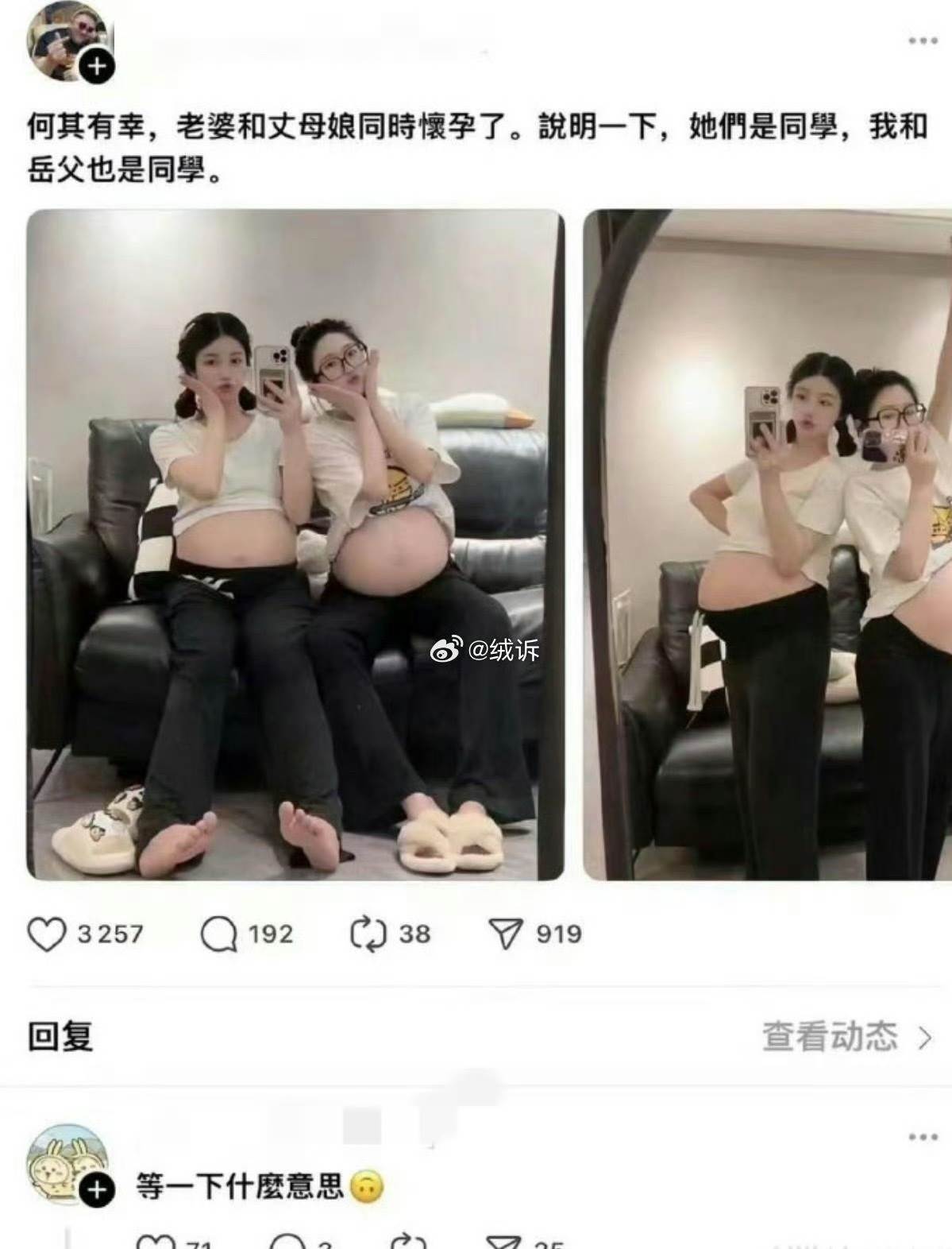 社交媒體上一則貼文引發軒然大波。照片中兩位孕婦並肩而立,配文寫道:「何其有幸,老婆和丈母孃同時懷孕了。說明一下,她們是同學,我和岳父也是同學。」這段令人費解的文字讓網友直呼「看得腦子亂掉」,直到有人梳理出背後的人物關係,才讓人恍然大悟。