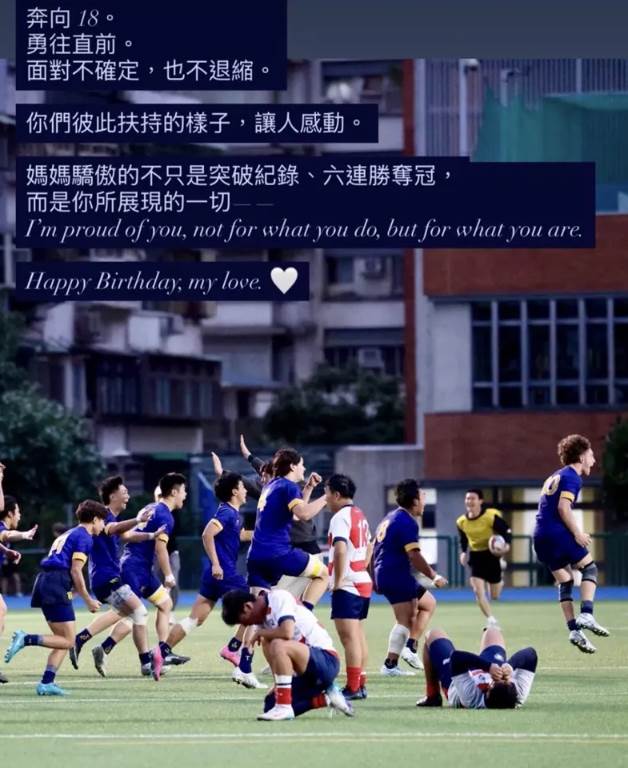 根據《自由娛樂》、《鏡週刊》報導,蔡依珊在限動中分享了連定捷參加比賽的精彩瞬間,畫面中可見他與隊友們在綠茵場上奔馳、歡呼,一同迎向勝利的喜悅。她感性地寫下:「奔向18,勇往直前,面對不確定,也不退縮。你們彼此扶持的樣子,讓人感動。」蔡依珊更進一步透露,身為母親最引以為傲的並非賽事成績或輸贏結果,而是兒子在整個過程中所展現的態度與品格,即便「突破紀錄、六連勝奪冠」只是一個結果,更珍貴的是一路走來的成長軌跡。