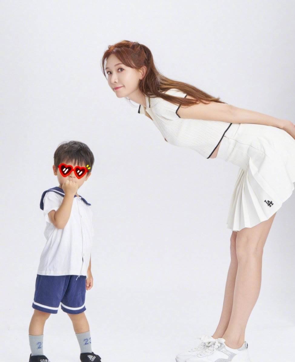 林志玲彎下腰俯身拍照,眼神中流露出幸福,兒子站在她身邊,母愛滿滿。