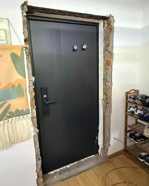 照片裡的這扇新門,是我和老婆逛了好幾家店才定下的。深灰色的啞光面板,搭配簡約的直線條紋,沒有多餘的裝飾,卻顯得高階又有質感。門鎖是智慧的,按一下就能解鎖,再也不用擔心忘帶鑰匙。門上還貼了兩個小小的裝飾貼,是老婆特意選的,說能讓門看起來不那麼單調。