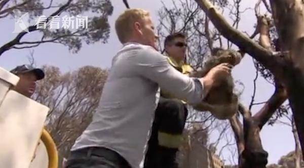 一名消防員靠近考拉媽媽,一邊進行安撫一邊將它抱起,另一人則在下方接住它們。考拉媽媽剛被抱離樹幹,立馬又抱緊另一根樹枝。救援人員只能不斷地進行安撫:「不,別這樣,你們得離開這棵樹。」