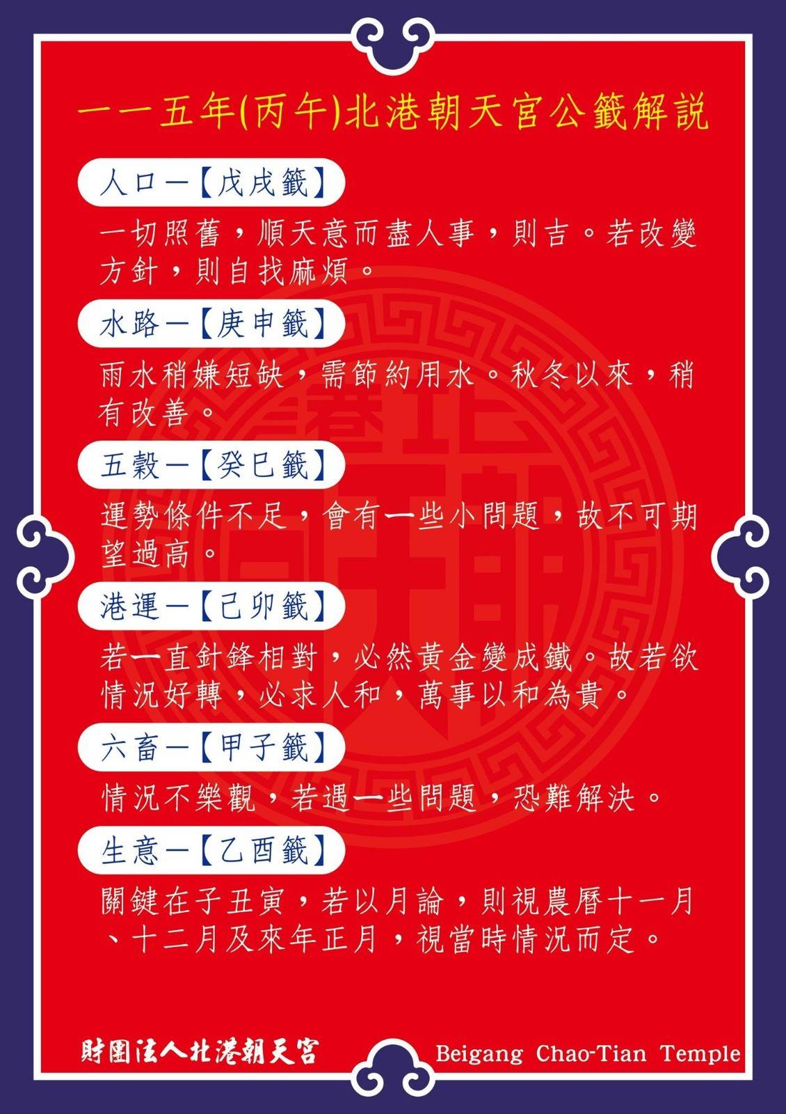 當日朝天宮依序抽取人口、水路、五穀、港運、六畜與生意等六支公籤。