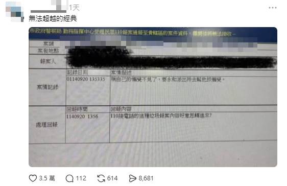 還有人分享了一張令人屏息的案件描述單,內容竟寫著:「稱自己的懶覺不見了,要永和派出所去幫他抓懶覺」,讓網友直呼是「無法超越的經典」。而針對領空安全的案件也沒少,有民眾報案「兩臺直升機盤旋請查處」,讓承辦警員無奈反問:「是要叫我打下來嗎?」