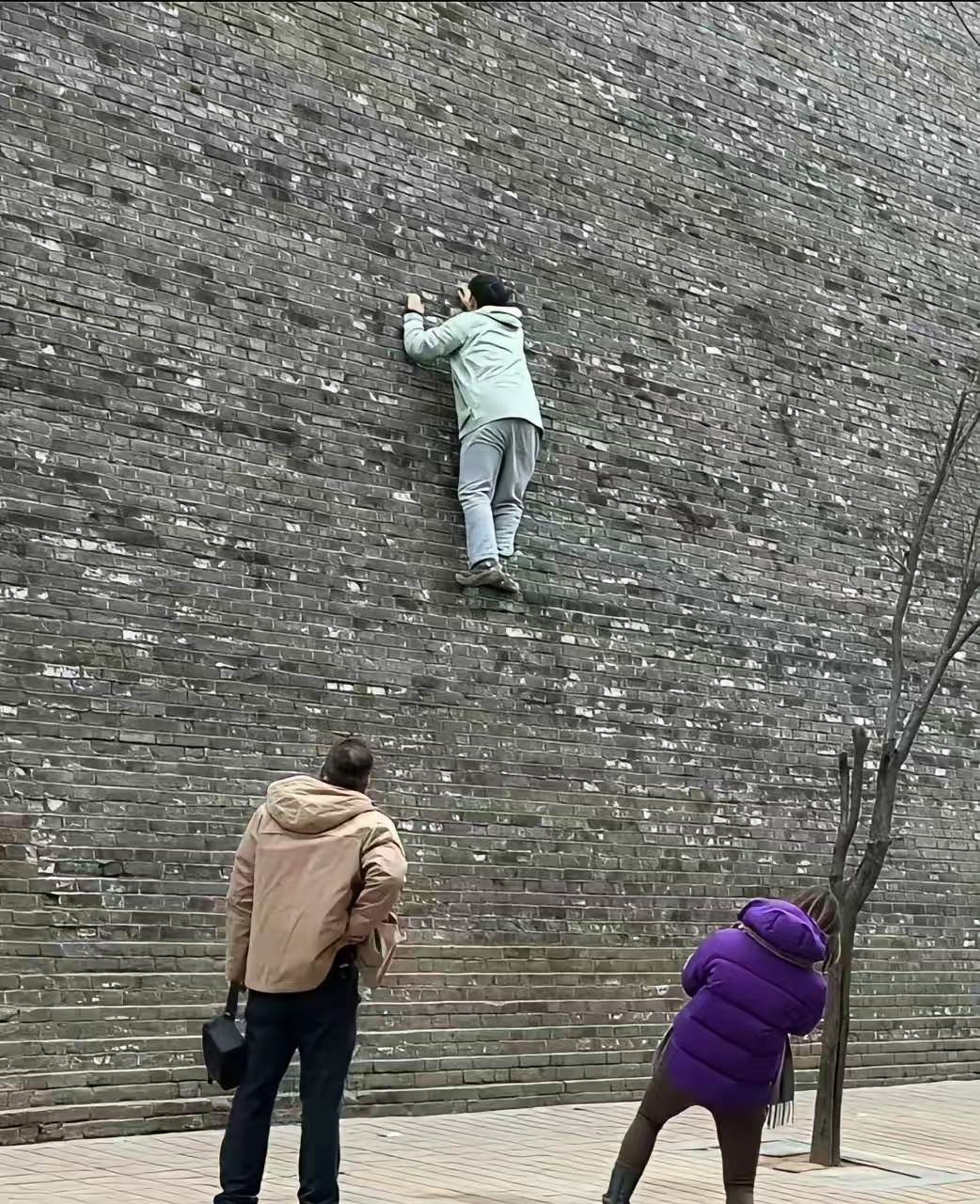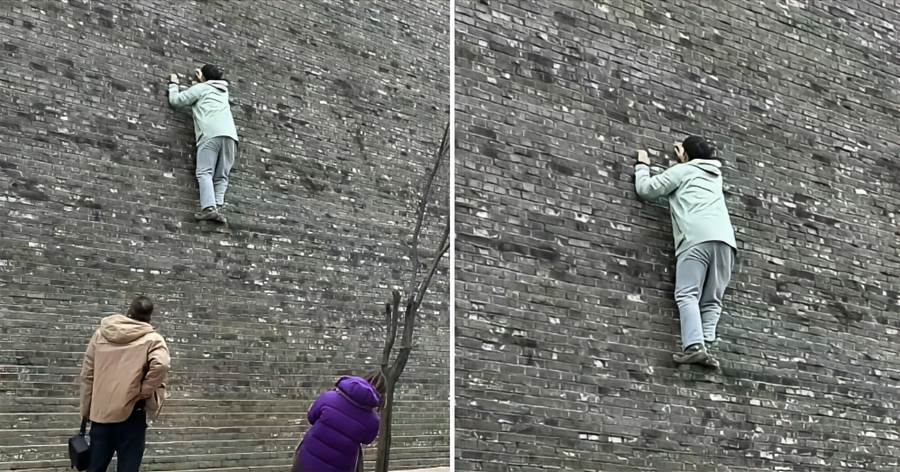 從現場畫面來看,這面城牆高達十幾公尺,磚塊間的縫隙不到一拳寬,男子卻毫無保護措施,雙手交替抓著磚縫,雙腳靈活尋找支點,短短幾分鐘就爬了將近三層樓高。下方兩名民眾看得目瞪口呆,其中穿紫色外套的女士還彎腰盯著牆面,連連喊著「我的媽呀,這也太勇了吧!」另一名穿駝色外套的男子則舉起手機錄影,嘴裡唸著「這要是摔下來可不得了,趕快報警吧!」