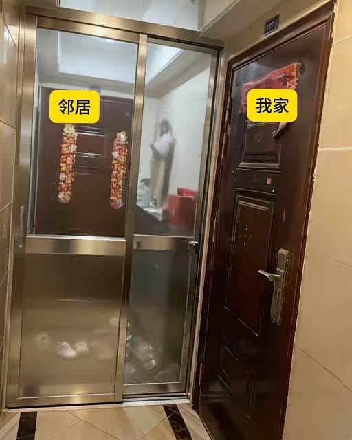 我家住在一梯兩戶的老單元樓裡,幾十年下來,連樓道瓷磚的反光都成了記憶的一部分。淺色牆面襯著米黃地磚,每天回家,左鄰那扇貼著紅底金字對聯的銀框玻璃推拉門總是最先映入眼簾——透過玻璃能望見玄關的鞋架;右邊是我家深棕色的防盜門,樸素卻踏實。