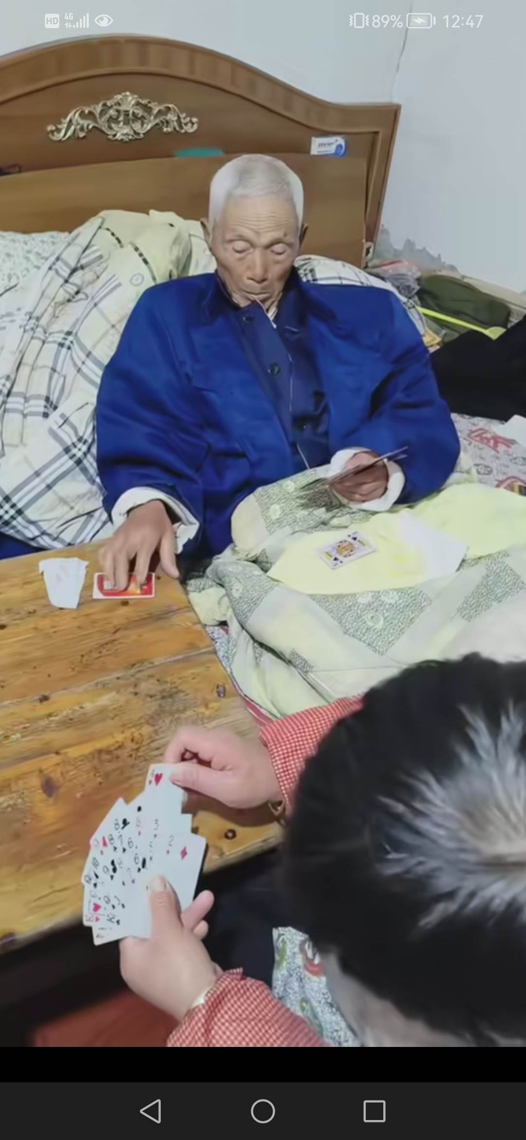 屋裡先是一靜,隨即,所有人都像接到了最要緊的聖旨。大兒子慌忙去拿牌,女兒把床邊的小桌支好,孫輩們七手八腳地扶著爺爺坐穩。一副有些年頭的撲克牌被小心翼翼地放在他枯瘦的手中。洗牌、發牌,牌局就在這張承載著生死的床鋪上開始了。