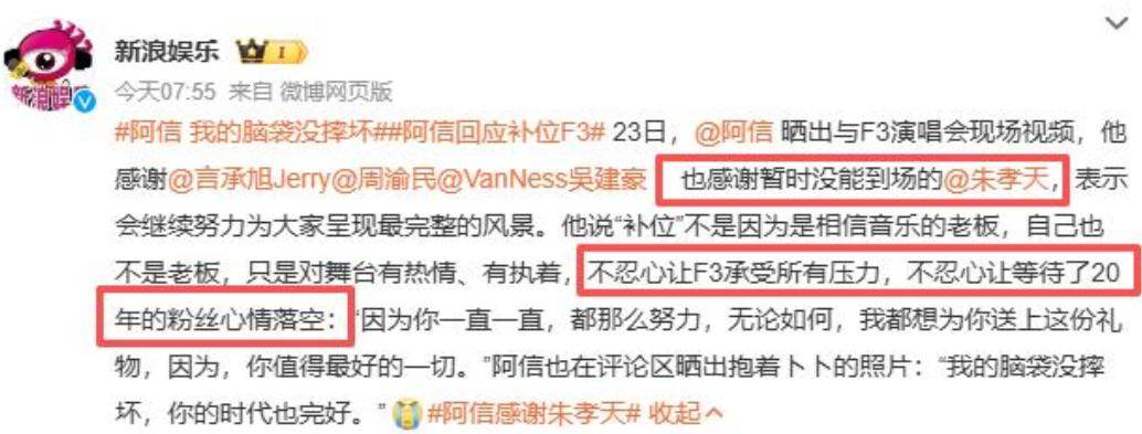 然而就在12月23號的時候,阿信在社交平臺上親自發文回應了這方面的事情,而比較關注他們的觀眾應該知道他這次是和「F3」一起舉行的演唱會。