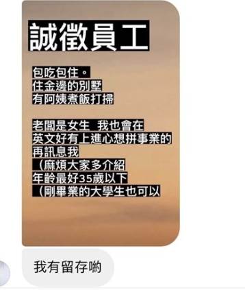 黃巧綸說,其實自己看到有人匿名PO出徵人的文章擷圖,就有覺得可能會被說嘴,她說自己其實是幫姊姊徵助理,主要是對到美國那邊,只是英文不太流利,才會需要有人幫忙,加上不希望姊夫誤會,所以希望助理是女生,她也無奈地說,重點是最後也沒找到人,對方覺得薪水太低,所以姊姊之後就找到了當地的英文助理,對于近期詐騙的事情,她也透露姊姊有說如果台灣政府有需求,也願意提供協助,只是自己對于家人的事情曝光非常不好意思。
