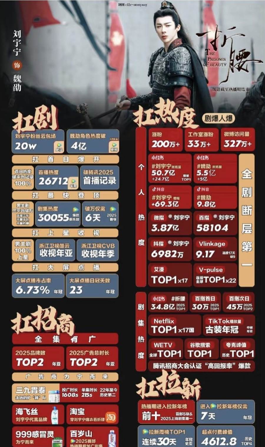 劉宇寧以草根網紅歌手逆襲為「性價比之王」,他主演《一念關山》為檸萌創收3億,《書卷一夢》爆賺4億,單劇商業價值預估超9億;被業內稱為「劉宇寧紅利」。