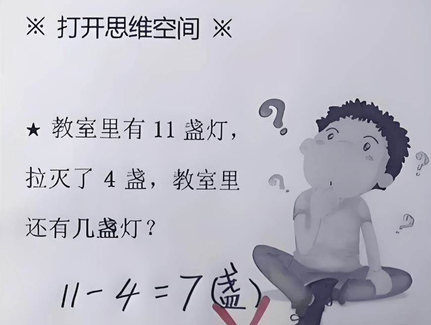 小學數學題,看似簡單卻暗藏玄機。一位三年級學生的家長最近就遭遇了這樣一道讓她也陷入尷尬的題目:教室里有11盞燈,如果拉滅了4盞,還剩幾盞燈?