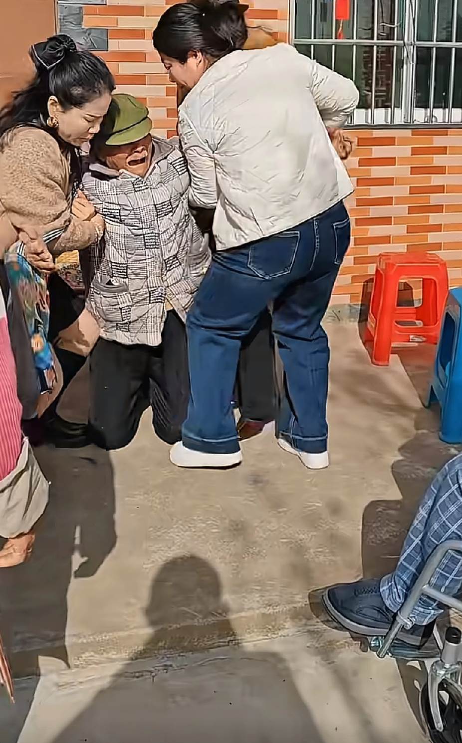 院子裡,紅藍塑膠凳靜靜立在磚牆邊,見證著這催人淚下的一幕。這份父愛如此沉重,如此純粹,它不講究方式,不問值得與否,只知道:孩子活著,就是這個家的天。