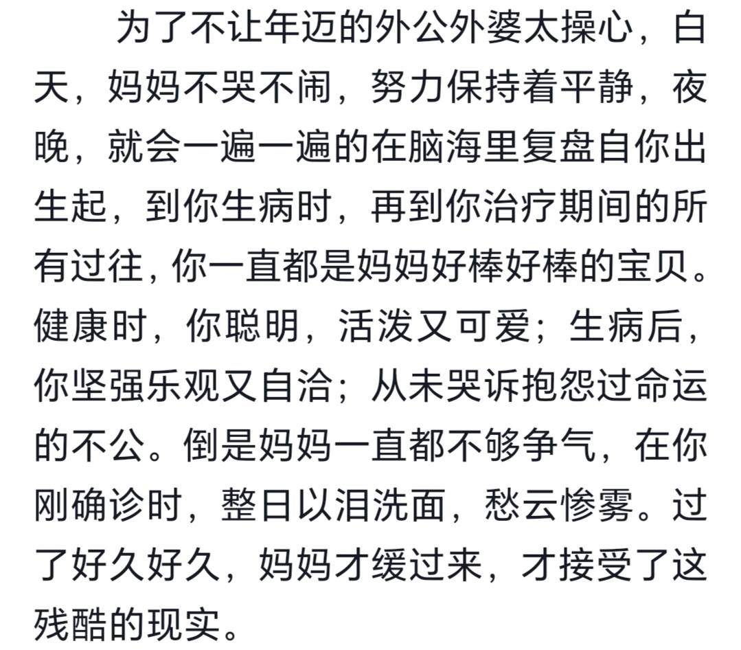 在媽媽的內心里,女兒是非常優秀的,不僅成績優秀,而且還非常懂事,即使生病了,還是非常的堅強樂觀,積極的治療病情,從來沒有抱怨命運的不公。