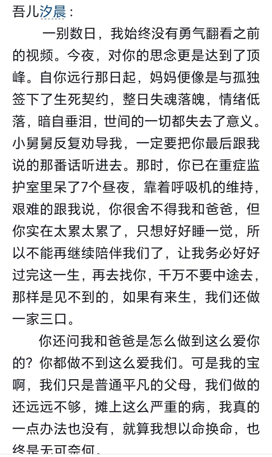 雖然才15歲,但是汐晨也知道自己的生命到了盡頭了,所以在昏迷前和媽媽說了很多話,讓媽媽一定要堅強,她舍不得媽媽和爸爸,但是自己太累了,所以想好好睡一覺,不能陪伴父母了,讓她們好好過完這一生,再去找汐晨,然后一家三口再續前緣。